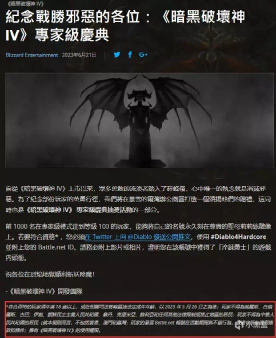 爲紀念《暗黑破壞神4》上線,暴雪舉辦了一個挑戰活動,前1000名在硬核模式達到100級的玩家,能夠將自己的名字永久刻在莉莉絲雕像上。但官方在公告結尾處標註到,該活動不包含中國大陸玩家。