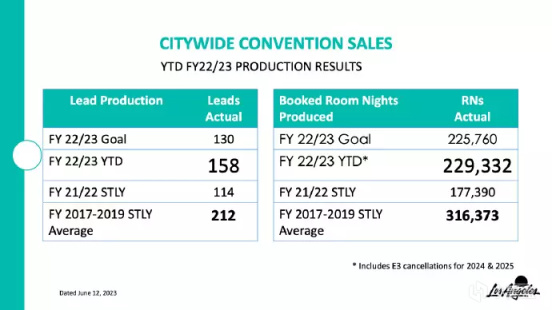 洛杉磯市旅遊委員會在6月21日召開例行會議,介紹洛杉磯旅遊業務的最新情況。在隨附的定期會議資料中,可以看到“* 包括 2024 年和 2025 年 E3 取消”的字樣。