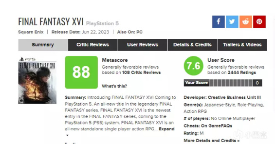 《最終幻想16》於6月22日正式登陸了PS5平臺,限時獨佔半年。本作M站均分88分,用戶均分7.6分。在M站的PS5遊戲分數排行中爲第21名。Opencritic均分90分。IGN與GS雙雙爲本作打出了9分的評價。