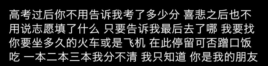 沒考好的也不要灰心,我知道可能對於你們來說打擊很大。這個沒事的,大不了我覺得可以再來一年。自己的路只有自己走出去,別人幫不了你,如果說自己都放棄自己了就真的沒了。還請各位考的老哥別引以爲傲欺負成績差的,並不是考上一個好的大學以後就能爲所欲爲,墮落的人無差別。