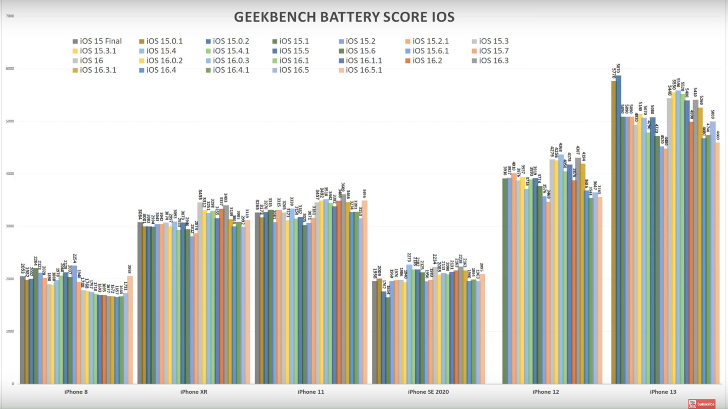 iAppleBytes 測試蘋果部分機型在不同系統版本的電池續航分數整理如下: