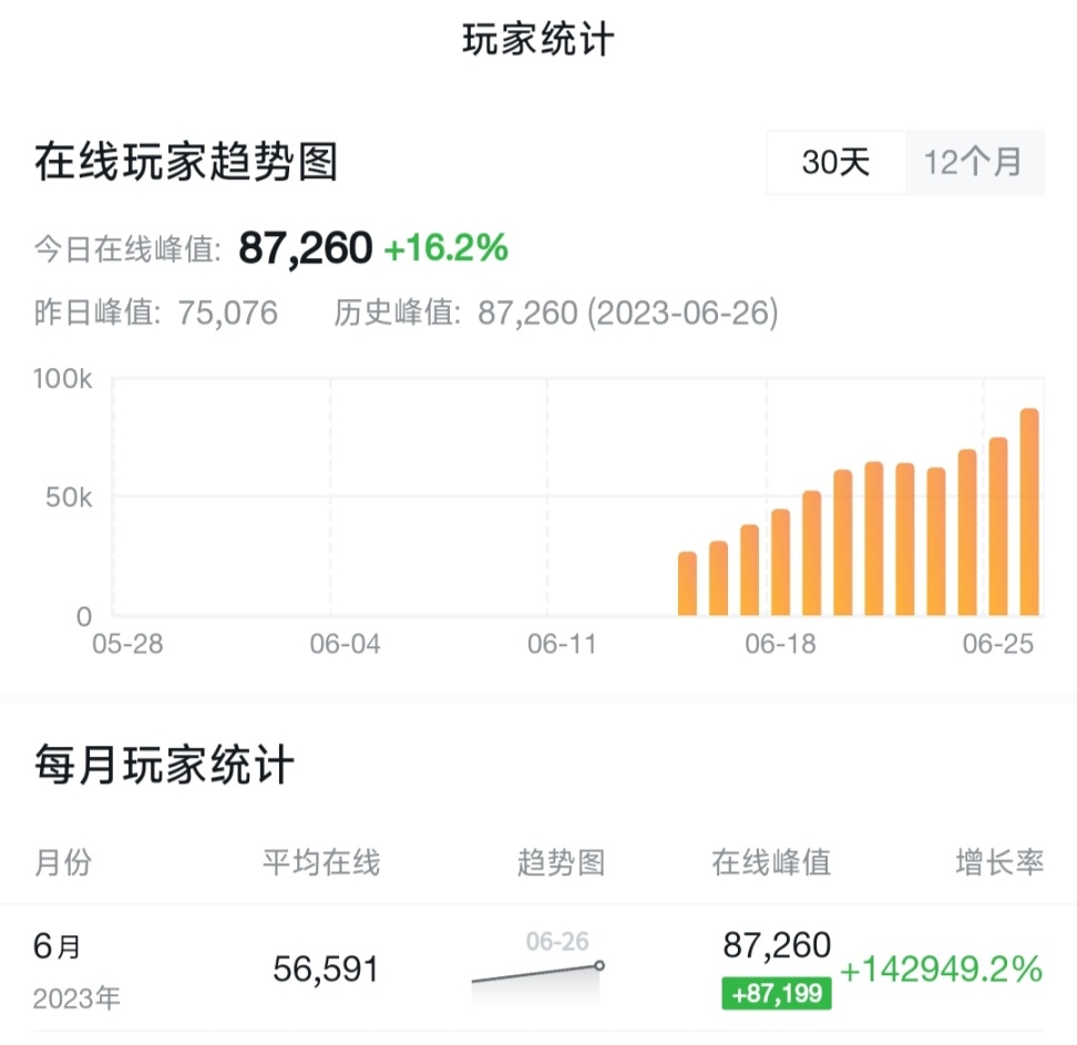 不同於許多人的唱衰,BBR的在線人數峯值可謂是一漲再漲,這也吸引了越來越多的玩家購買。截止6月26日,恰逢歐美的週末,使遊戲在線人數屢創新高,26日凌晨達到8.7萬的新高。