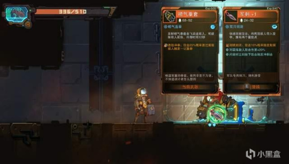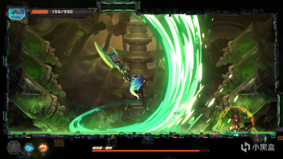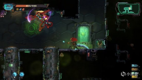 遊戲容易迷路是我個人認爲比較麻煩的事情,遊戲戰鬥區域整體以黑色背景爲主,場景機械風格與背景相融合。地圖設計有較多的隱藏式出入口,也有較多的連接平臺,跳臺,複雜的場景容易在一波戰鬥之後找不到路,頻繁的尋路則會讓遊戲顯得繁瑣和無聊。