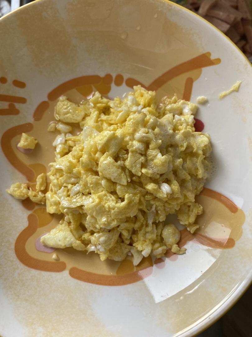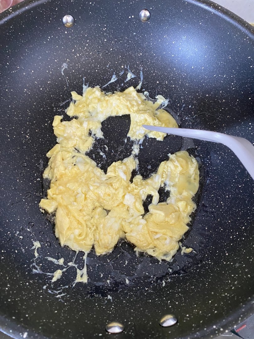 2.起锅烧油把鸡蛋炒碎,捞出备用
