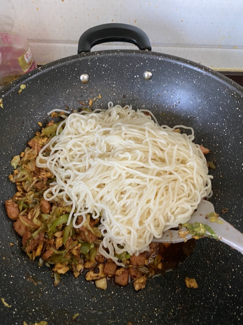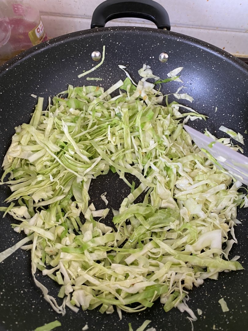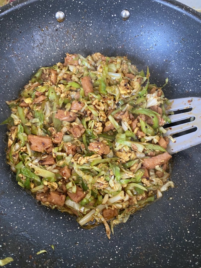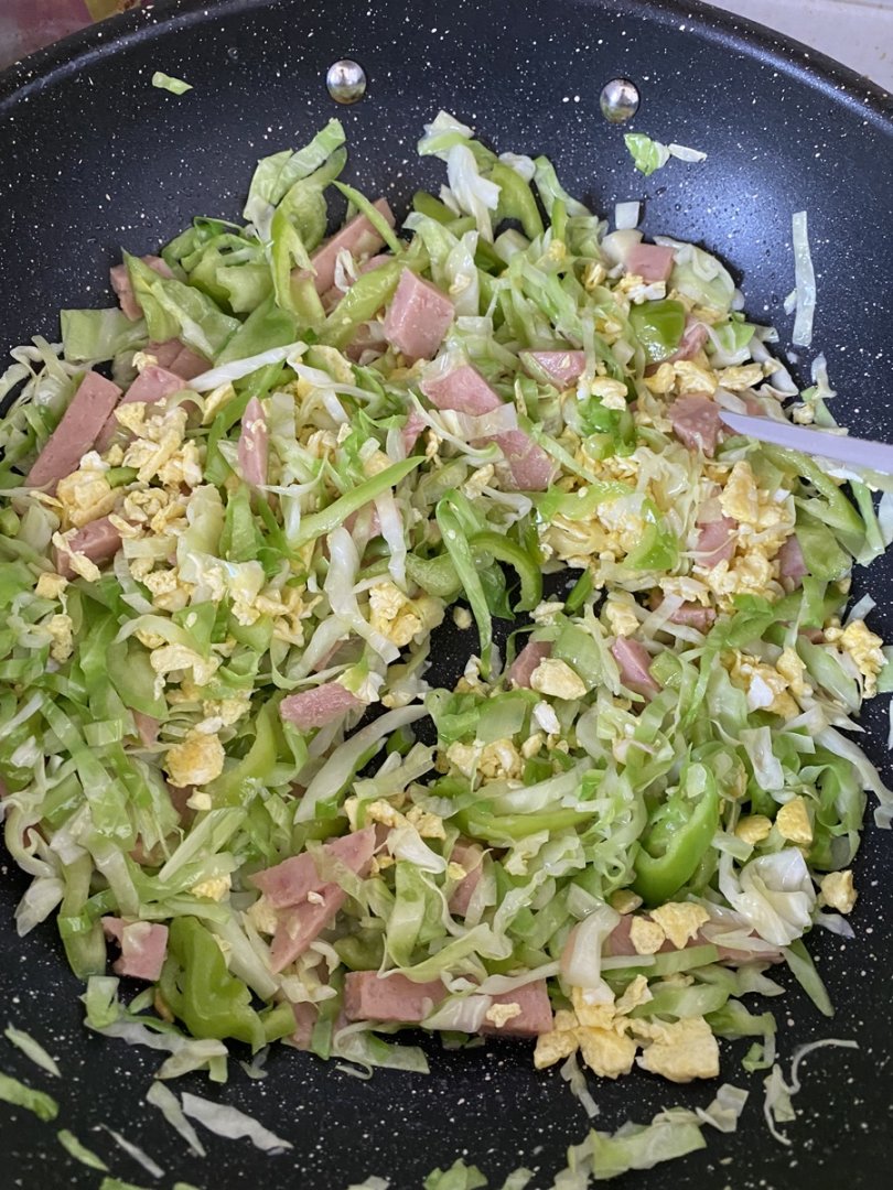 3.在原有基础上再加点油,油热下包菜,包菜翻炒后再加入青椒和午餐肉继续翻炒,最后加入鸡蛋
