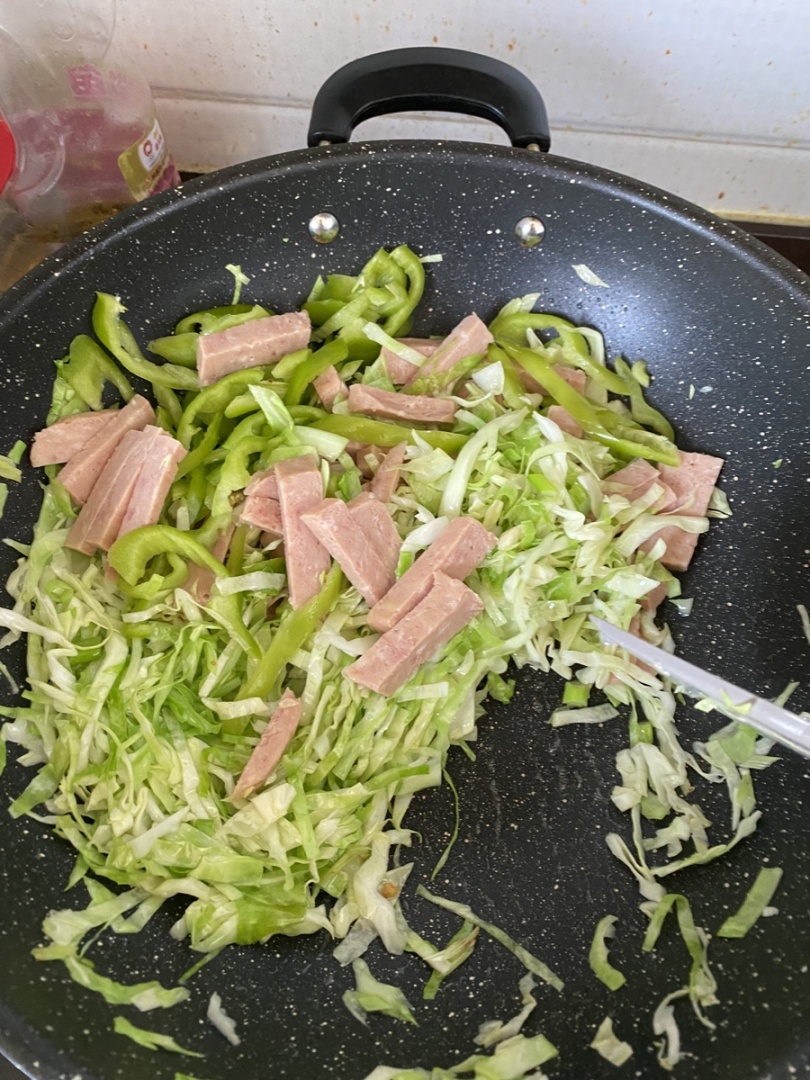 食材准备:鲜的细面条,包菜,火腿或者午餐肉,青椒,鸡蛋