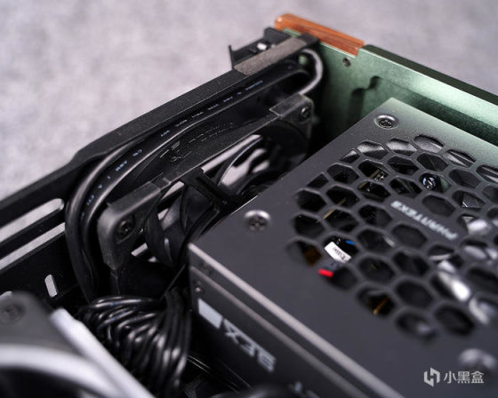 安裝 SFX 電源,打理好線材,電源下方可支持安裝 120 風扇進風,增強平臺的散熱,這邊塞了一顆貓頭鷹的 A12X25 黑化版。