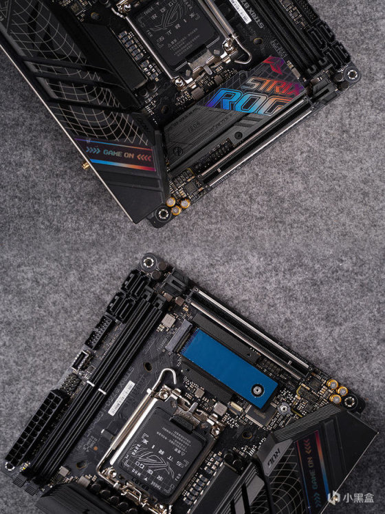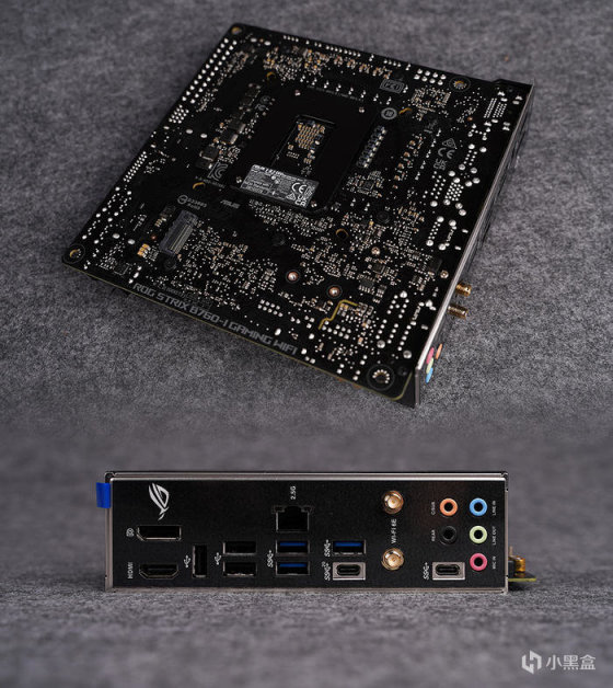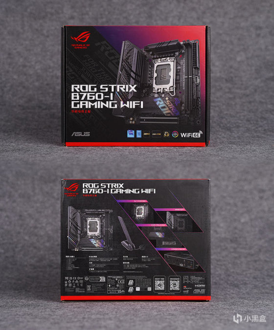 選用的主板華碩 ROG STRIX B760I GAMING WIFI,延續 ROG STRIX 系列的包裝設計,正面搭配主板本體展示,燙印的型號示意等,背面圖文展示主板的規格賣點等信息。
