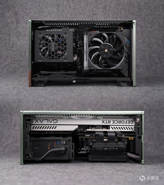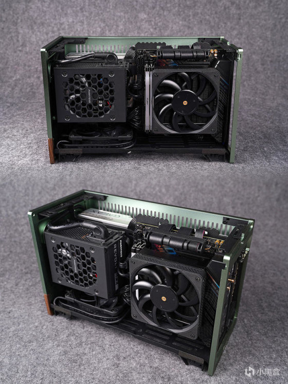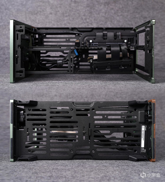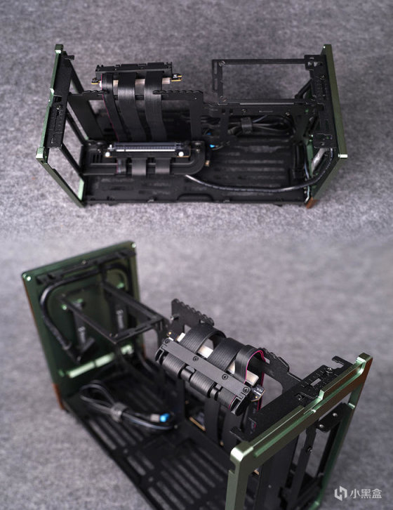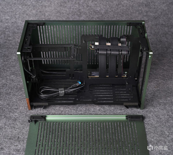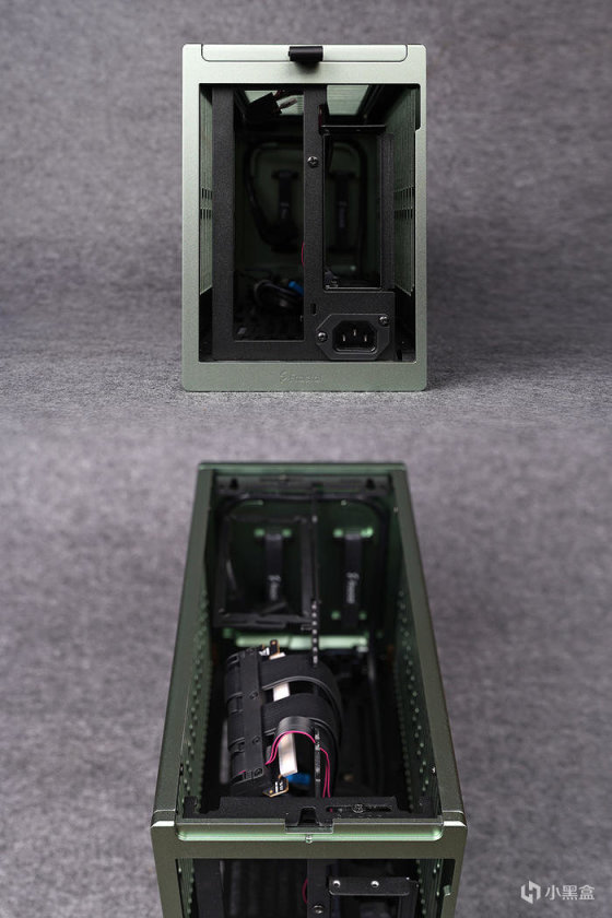 Terra 給到有黑銀綠三色可選(這邊爲綠色),具體尺寸 343 × 153 × 218mm,體積只有 10.4L 左右,標準 Mini-ITX 主板支持,兼容 SFX/SFX-L 電源( 最大 130mm ),顯卡長度最大支持 322mm,另外還具備安裝空間上的調整( 7 個檔位調節設計 ),通過調整中框安裝支架,對應不同高度的下壓式散熱和不同厚度的顯卡,下壓式散熱支持範圍:48-77mm,顯卡厚度支持範圍:43-72mm。另支持 120mm 風扇及水冷安裝,還有 2 個 2.5 寸硬盤安裝位。