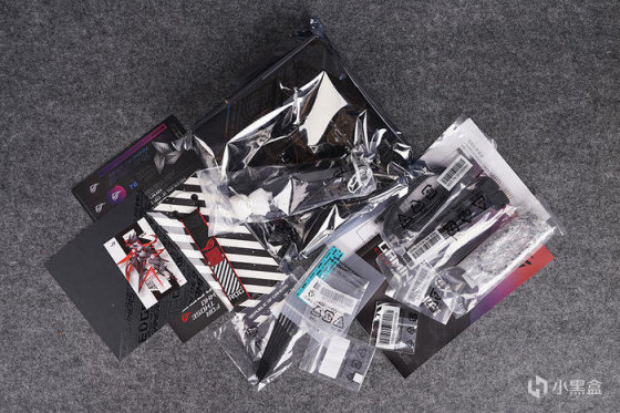 翻箱後的全部附件,包含有WIFI 天線、入會卡片、信仰貼紙、ROG 鑰匙掛件、各種連接線、M.2 螺絲、說明書等。