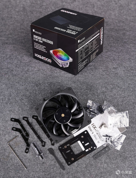 選用喬思伯 HX6200 散熱器,另有白色版本可選,外包延續這個系列黑色風格,印刷有散熱本體展示,英文標註型號及規格,官標 TDP 200W,出廠預裝 12CM 風扇,其它附件包含說明書、暴力熊硅脂、刮刀,扣具支架螺絲等( LGA115X / 1200 / 1700 / AM4 / AM5 )。