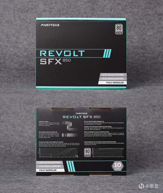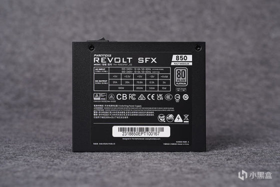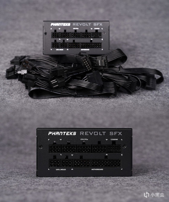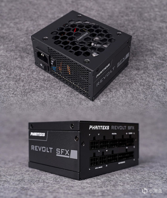 電源本體,採用標準 SFX 電源尺寸規格,具體 125×100×63.5mm ( L x W x H ),兩側 PHANTEKS REVOLT SFX 文字內容修飾,示意品牌及型號。