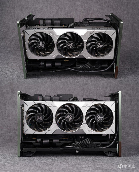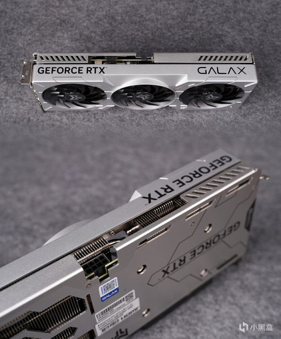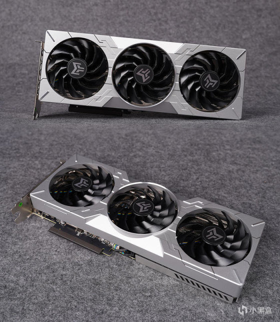 顯卡外觀延續系列全金屬外殼和無燈設計方案,上蓋採用的是一體壓鑄鋁合金材質,金屬感十足的銀灰色,外觀不同以上代的圓潤,這代造型方正剛硬,表面輔以不規則的幾何與交疊線條修飾,以宇宙魔方爲靈感,呈現出錯落有致的美感,細節之處做了 CNC 高光高亮處理、金屬材質增加產品質感的同時,亦可起到被動散熱的效果,提升散熱效能,搭配三個 92mm 規格散熱風扇,直徑 102mm、具備 11 片扇葉,扇葉採用空氣動力學測試而來三折造型設計,可實現更高風壓及更大風量,另支持智能啓停技術。