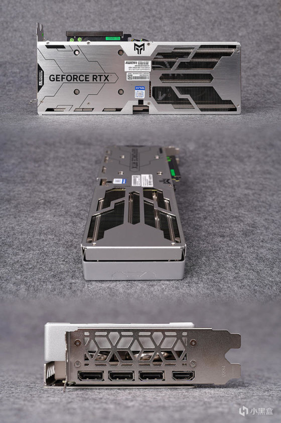 配備金屬背板,,實際 PCB 比散熱器短上一截,鏤空外露大面積的散熱鰭片,通過貫穿式風流增強散熱,這樣更易於快速的帶走熱量,採用標準雙卡槽設計,接口給到有 3 個 DP 1.4a 接口及 1 個 HDMI 2.1 接口。