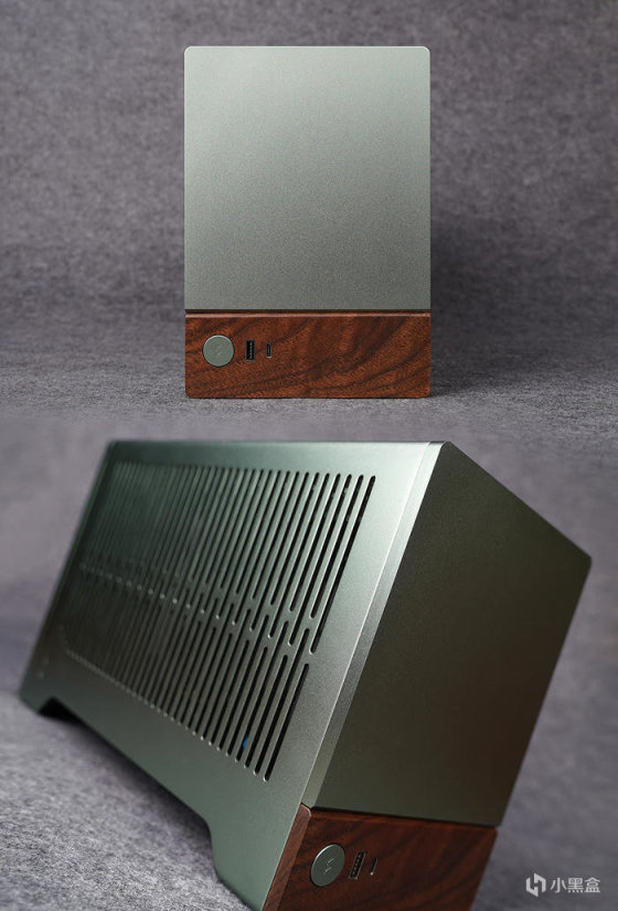外鋁合金與實木材質,前面板採用撞色設計,上半部分爲厚實的鋁合金,下半部分則爲胡桃木, IO 集成在實木面板上,依次爲開機鍵、USB 3.0、USB 3.1 Gen 2 Type-C。