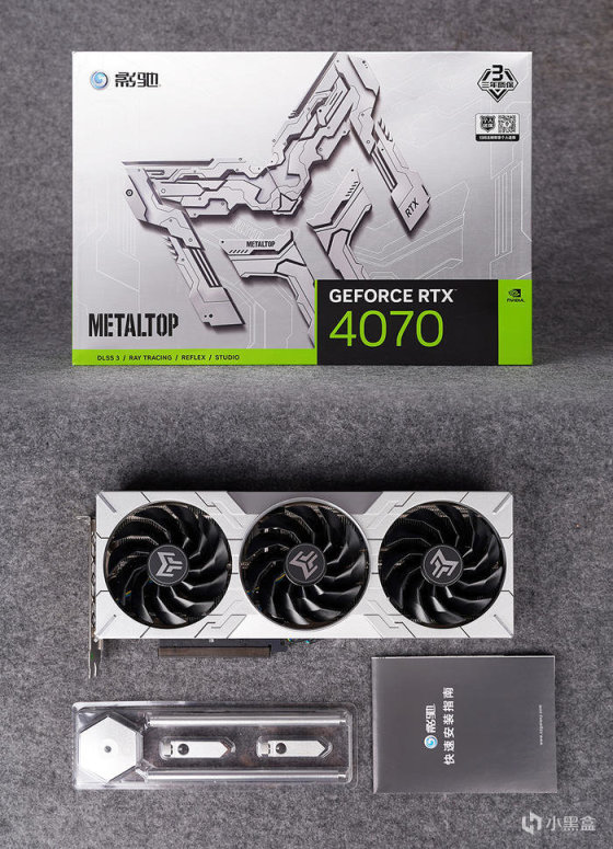 搭配顯卡影馳 RTX 4070 金屬大師 OC,包裝上依舊延續了金屬大師系列經典設計,亮銀的配色搭配金屬機甲質感的 LOGO,裏頭出廠給到了一條 16PIN 轉 2 × 8PIN 供電線、一個顯卡支架、還有安裝指南及質保卡。