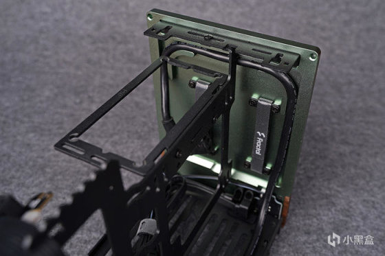 電源下方支持安裝 120mm 風扇,邊上亦支持安裝 120 冷排一體式水冷( 短顯卡情況下 ),電源安裝支架附帶有銅柱固定安裝,可留出空間用來收納線材,另外前置面板內還有 2 個 2.5 寸硬盤安裝位,另值得一提也就這位置的電源線還帶有 CNC 加工線槽。