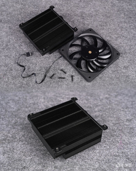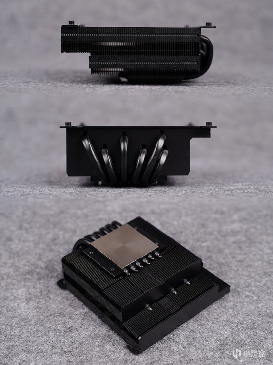 散熱本體,通體黑色噴塗處理,一側缺口避讓設計,爲了與目前 ITX 主板的高 IO 散熱模塊及內存避讓,提高兼容性,做工主流水準,折邊全扣 FIN 工藝,鰭片之間緊緻工整,六條 6mm 熱管,接觸面 CNC 同心圓鏡面處理,鰭片和熱管及底座,三者採用的是迴流焊工藝焊接而成。