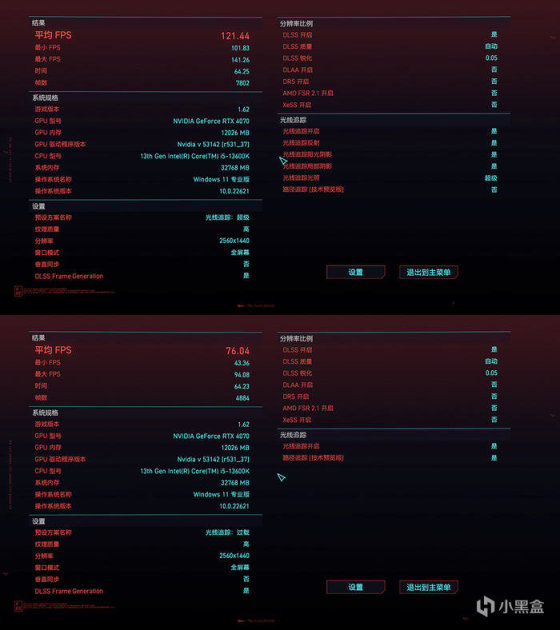 遊戲測試,賽博朋克 2077,最新 1.62 版本,除支持 DLSS 3,另還有過載光追選項,2K 1440P 分辨率,畫質設爲最高預設,DLSS 質量自動,超級光追平均幀數 121.44,過載光追平均幀數 76.04。