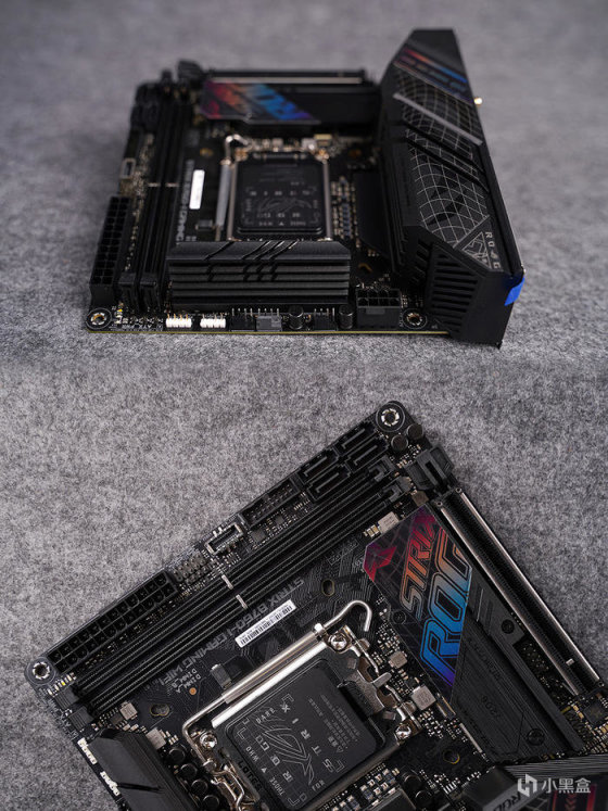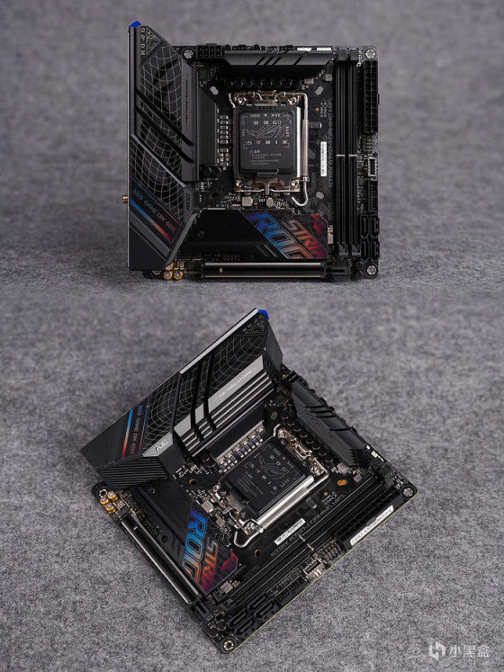 主板定位於中端用戶玩家,採用標準 MINI ITX 版型規格,延續 ROG STRIX 系列的設計語言,黑色系外觀,馬甲斜面切割機甲風格,表面 ROG 圖案文字修飾點綴,整體顏值外觀在線。
