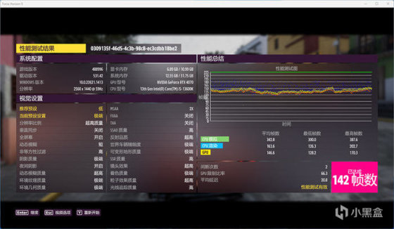 常規 DLSS 遊戲,FORZA HORIZON 5,2K 1440P 分辨率,畫質設定極高,平均 142 FPS。