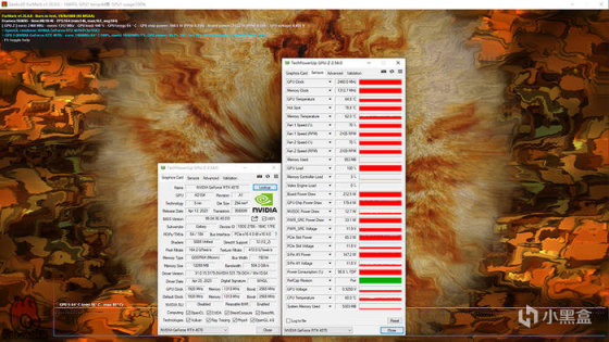 FURMARK 滿載測試,過程 20 分鐘左右,影馳 GeForce RTX 4070 金屬大師 OC, GPU 頻率 2400MHz,顯存 1312MHz ,核心溫度 64.8 度(結溫 78.8 度),顯示功耗 212W 左右。