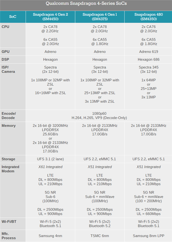 相比於去年9月份發佈的一代驍龍4,高通這次將製造工藝從臺積電6nm升級爲三星4nm——二代驍龍8、二代驍龍7+、一代驍龍6也都是4nm。