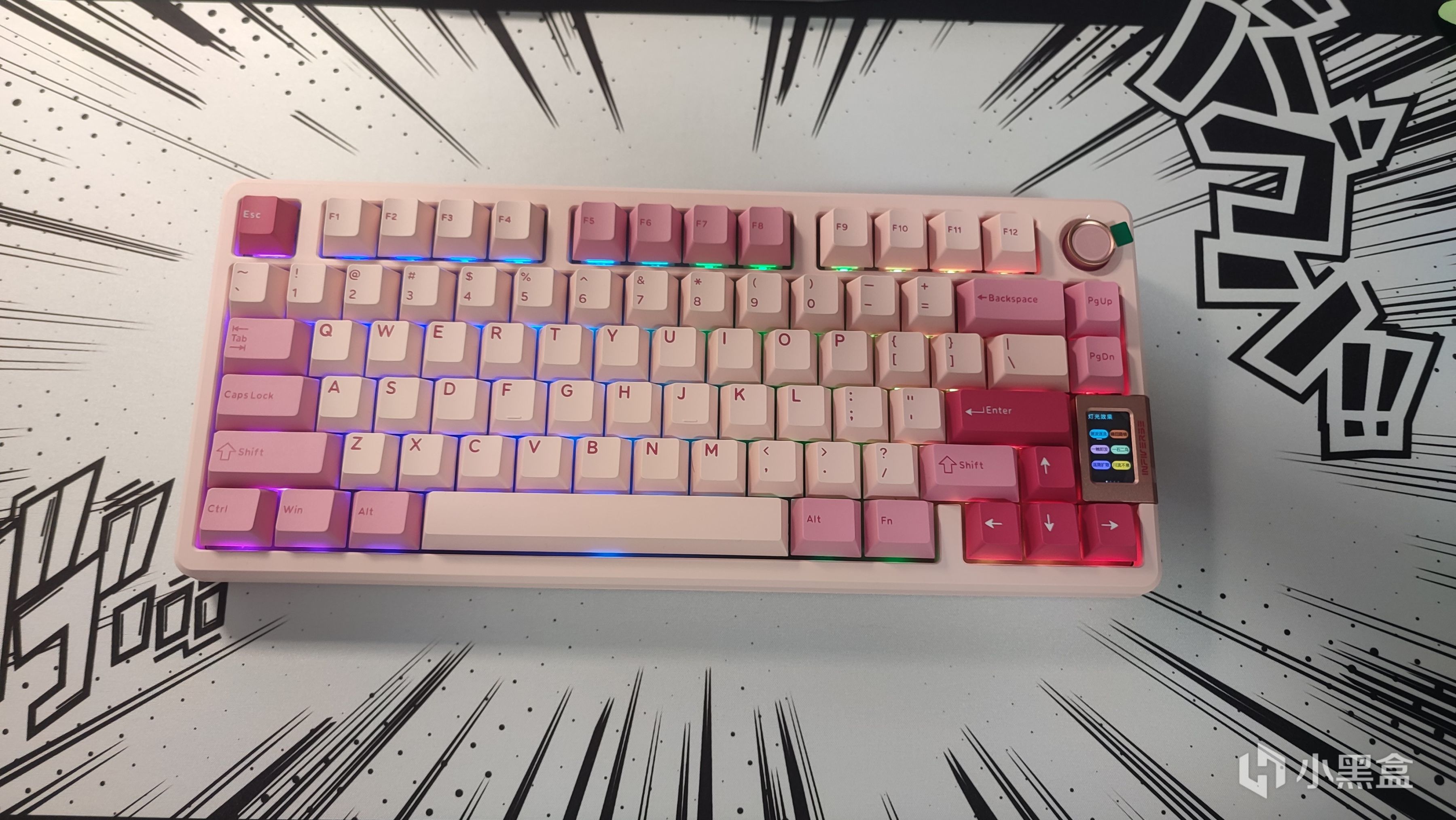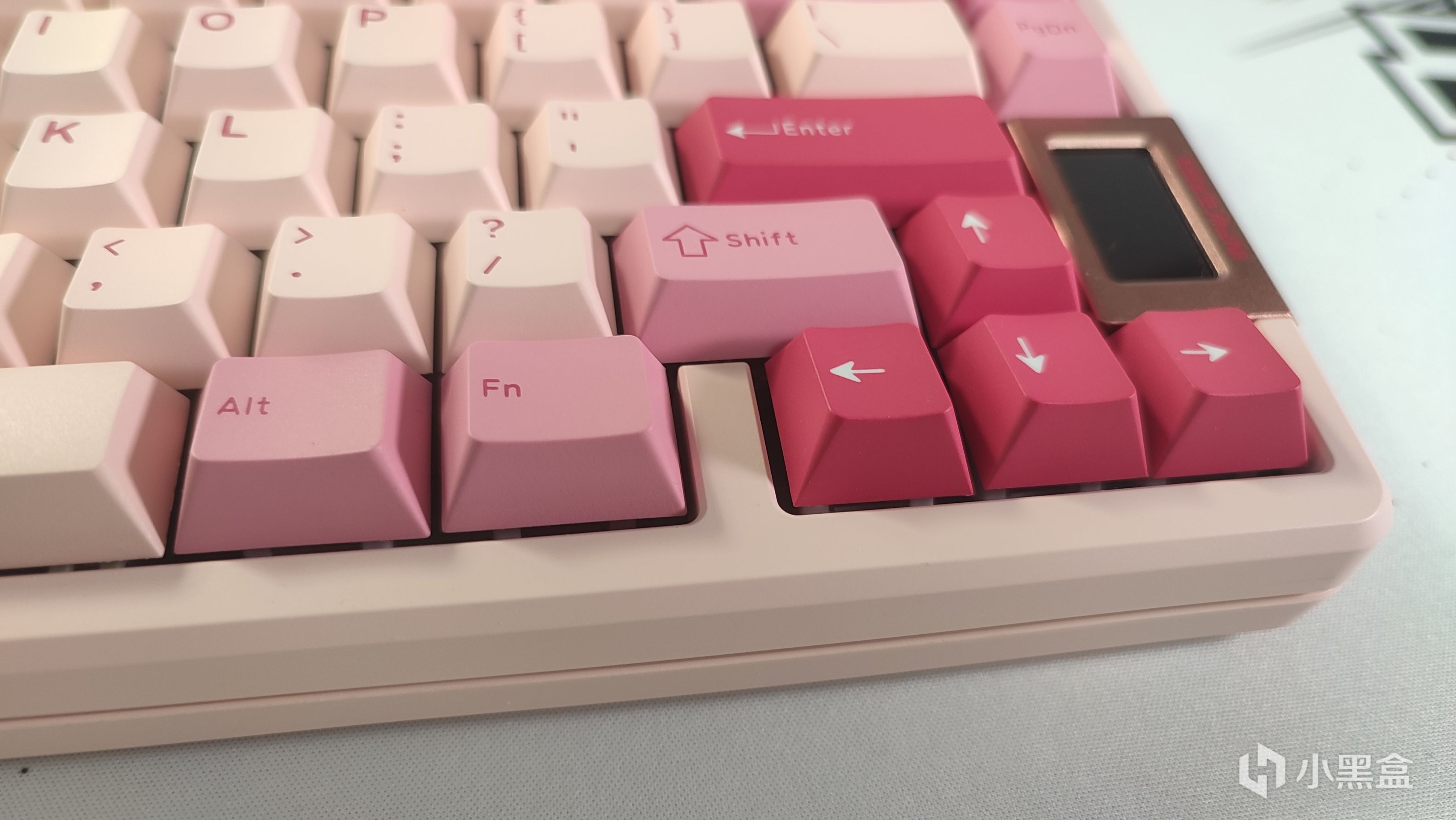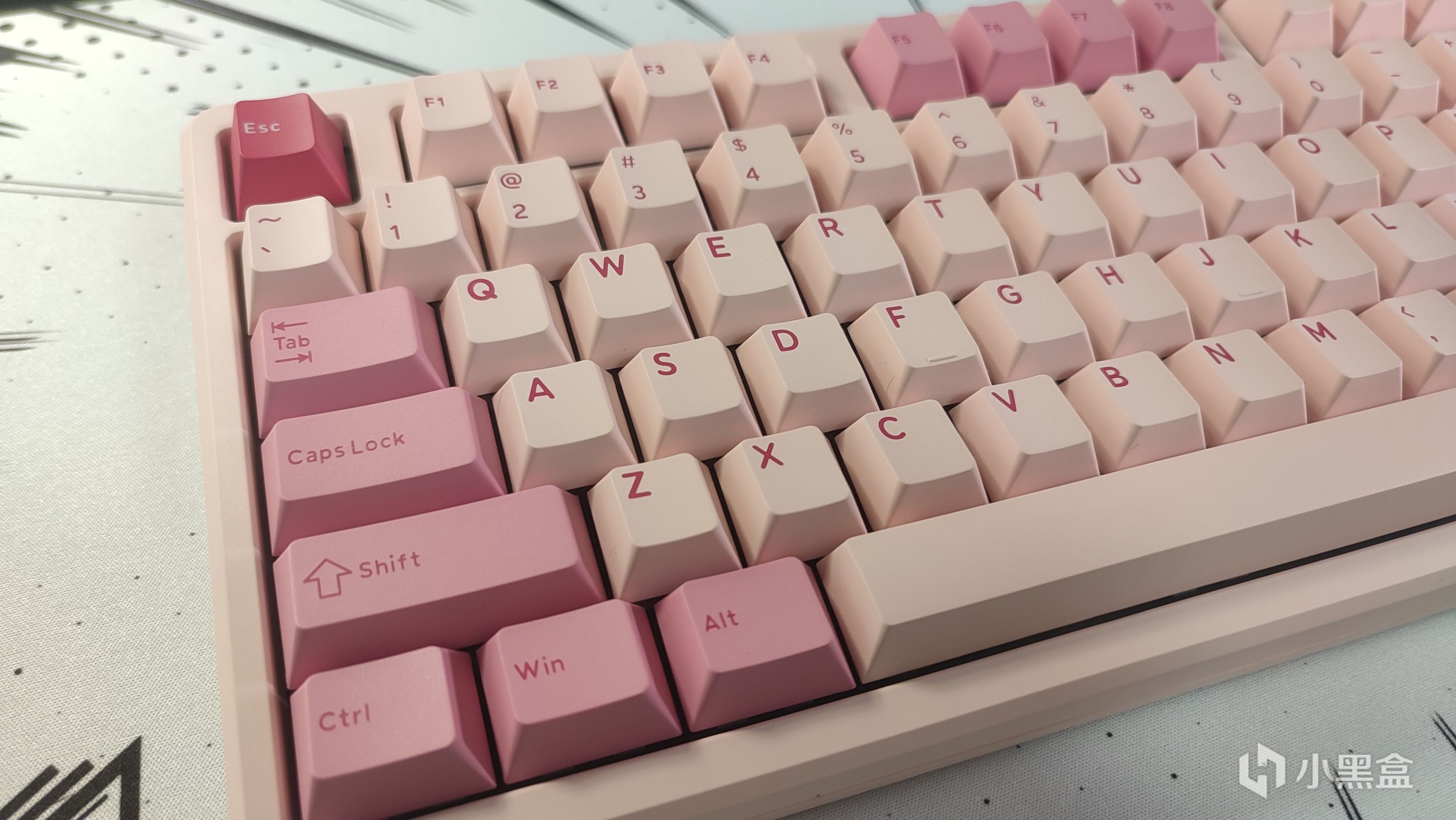 键帽颜色采用了三拼色的设计,大部分键位均采用的是淡粉色作为底色,颜色可以参考键盘套件的颜色,字符则是采用比较深的暗红色,部分键位使用粉色作为底色,同样以深红色作为字符颜色。部分特殊键位例如esc以及回车和方向键,则是采用前文所说的暗红色,字符则为白色。