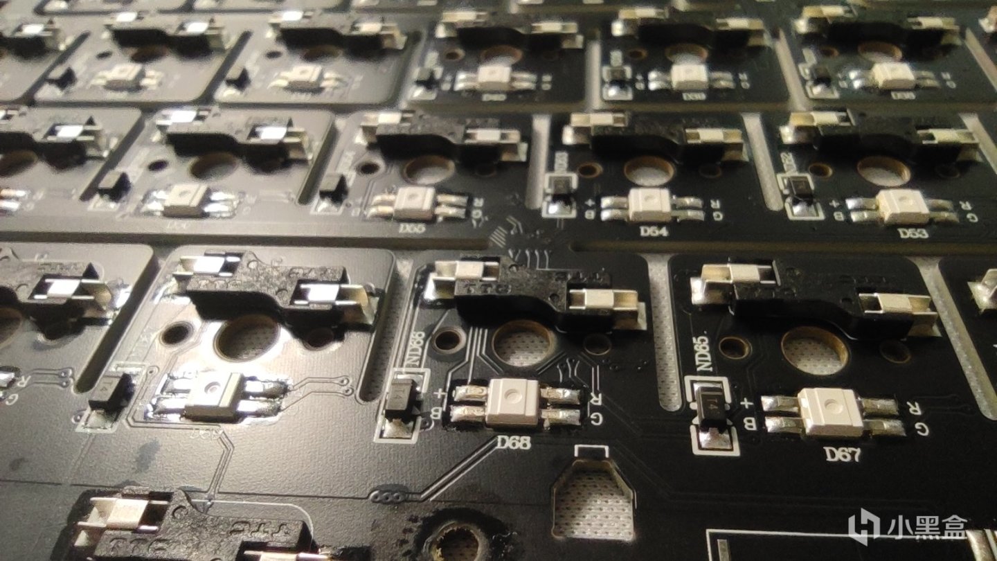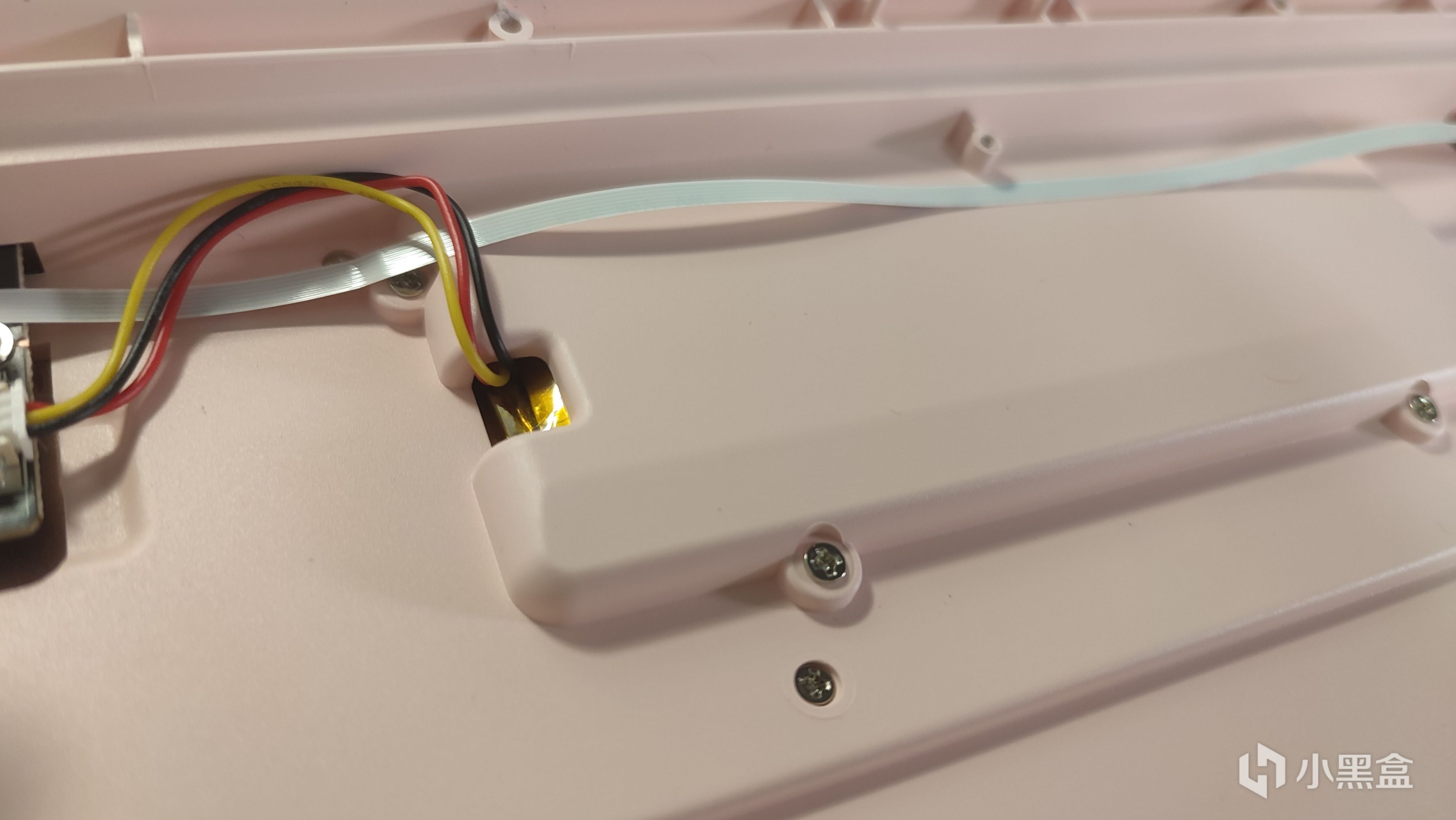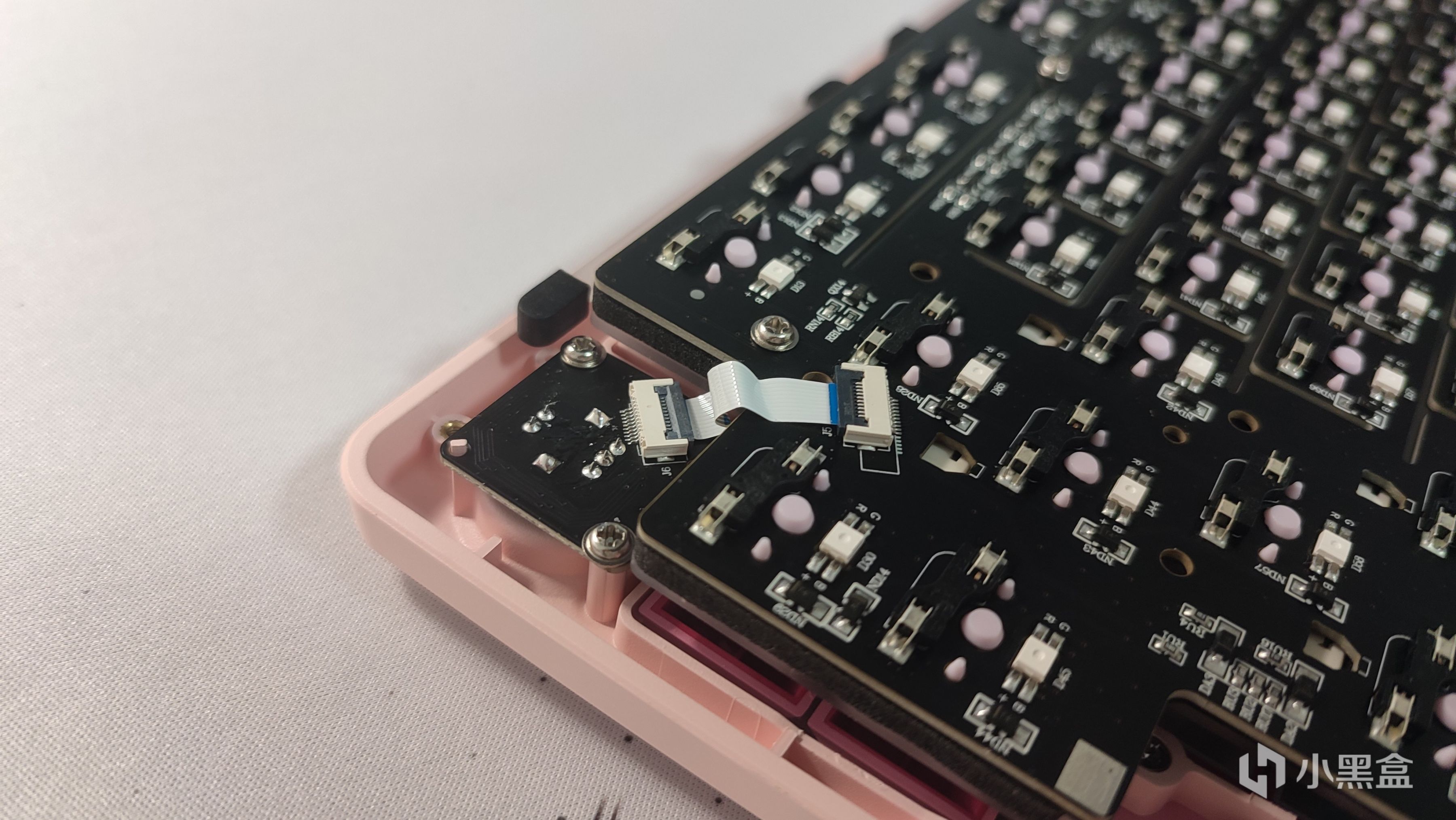 背板也是通过螺丝固定到底壳,type-c插口以及各种开关也是固定在这上面,开关有一些晃动能自己搞定的可以尝试自己改一下。这块背板只有中间一大片是塑料,边框以及最中间的LOGO都是金属材质,并且做了高光处理,也就是客制化常见的阳极氧化,质感拿捏的很到位。