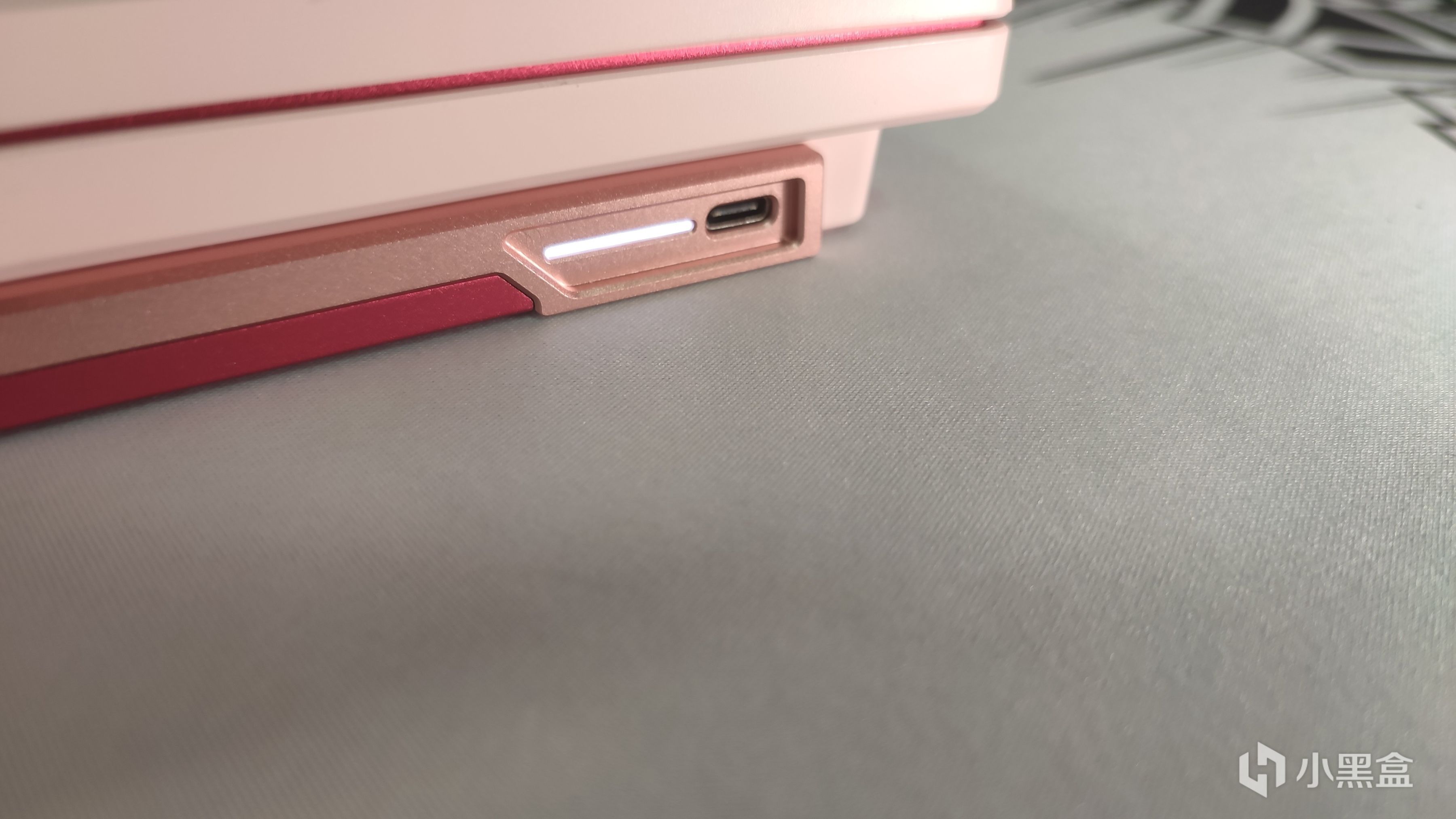 数据线插口以及开关都放到了顶部,左边是win/mac切换开关以及三模连接切换开关,不过没有给标识提示,初上手稍微认识一下倒也没什么影响。数据线插口放到了最右侧,旁边有一行灯带,键盘处于正在使用的状态的时候会亮起来(似乎感觉没太大用?)