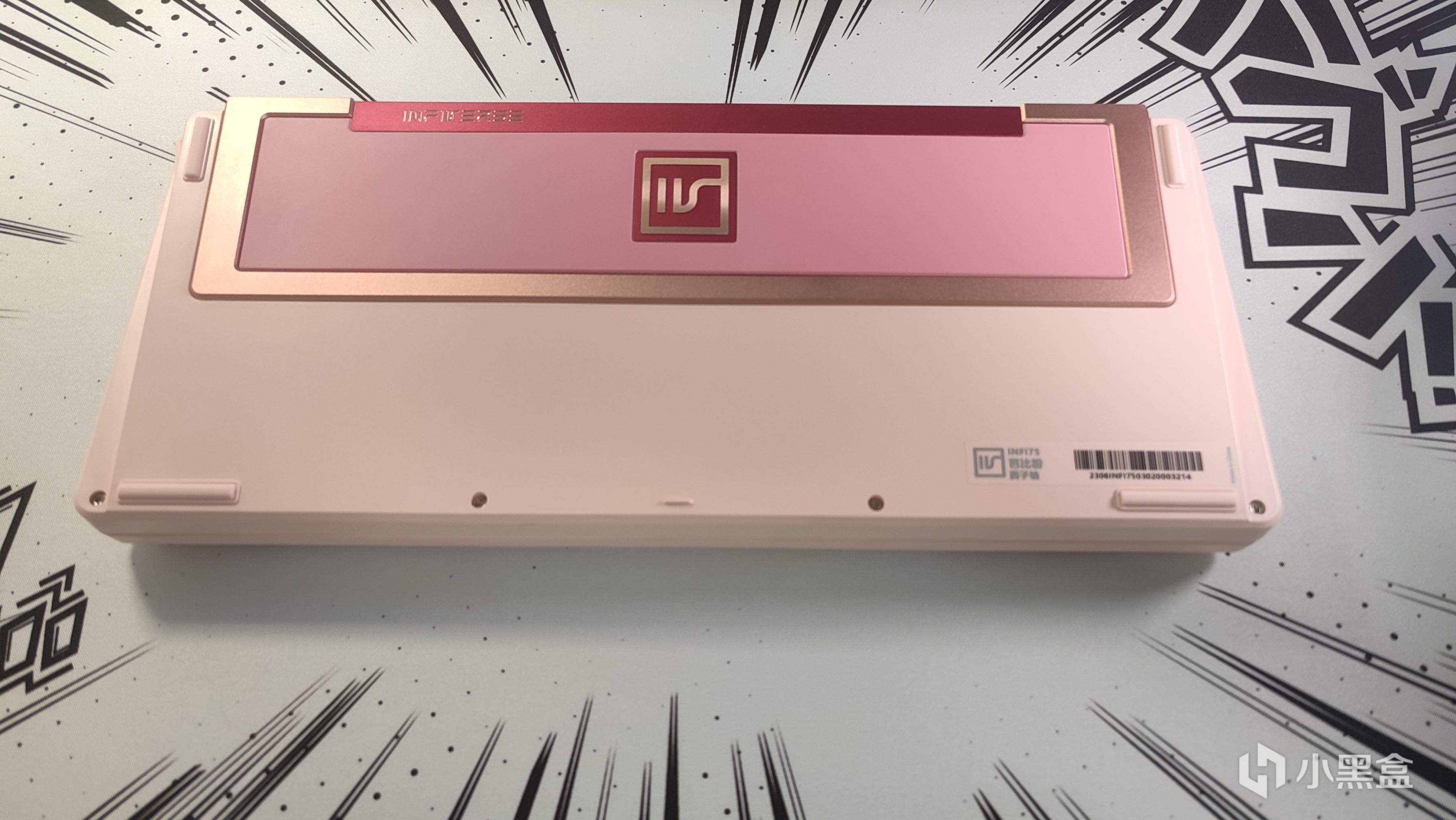背面能看到一大块背板,对于大多数量产键盘没有设计的背面来说算得上降维打击,正中间是INFI的LOGO,斜上方能看到INFI的品牌名字,LOGO设计以及字体样式绝对称不上难看。不过由于结构设计,INFI75并没能够加装双段脚撑,不过防滑脚贴还是配备齐全的。