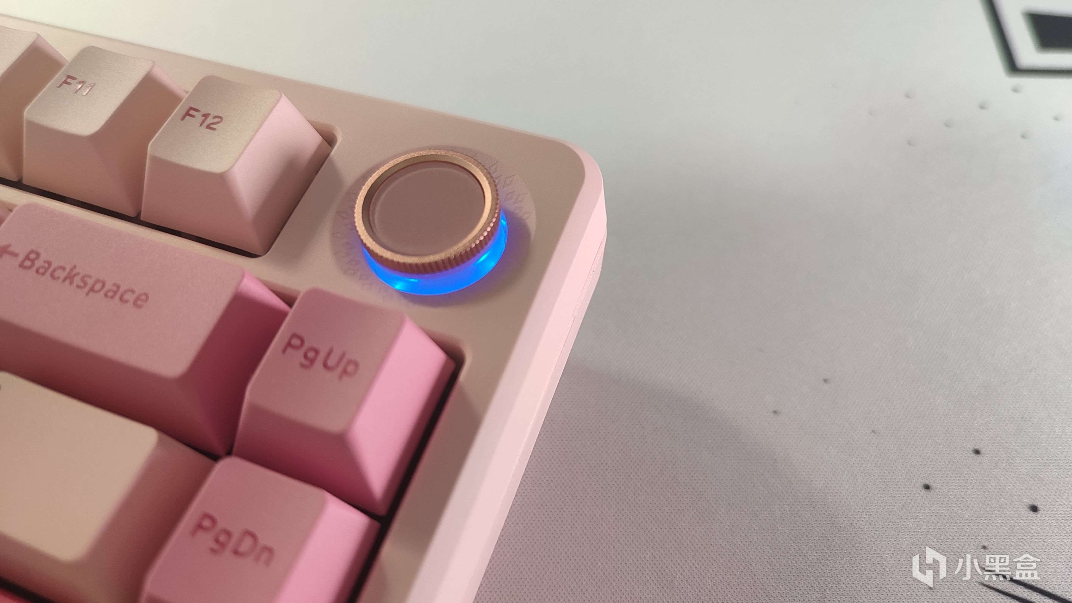 和大多数75%键盘一样,INFI75右上角增加了一个旋钮,不过不同于他们的是,INFI75的这个旋钮并非正常高度,而是砍了一半高度的半高旋钮,同时旋钮也是单独开模定制,底部采用高透材质,可以映出旋钮底部的灯光,顶部周围是金属材质同时带有纹理,实际触感还是很不错的。顶部则是采用的比较光滑的材质,还是比较容易刮花的,算是一个缺点。