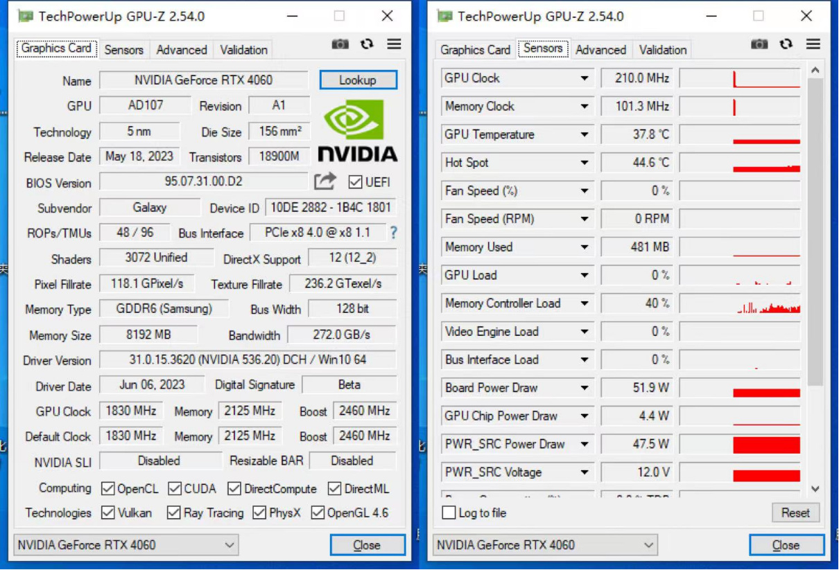 將GPU Z 更新至2.5.4版本,即最新版,玩家們即可得到影馳 GeForce RTX 4060 金屬大師的產品規格和基本參數。從圖中我們可以得知,該卡的待機溫度爲37.8°C,功耗爲11W。