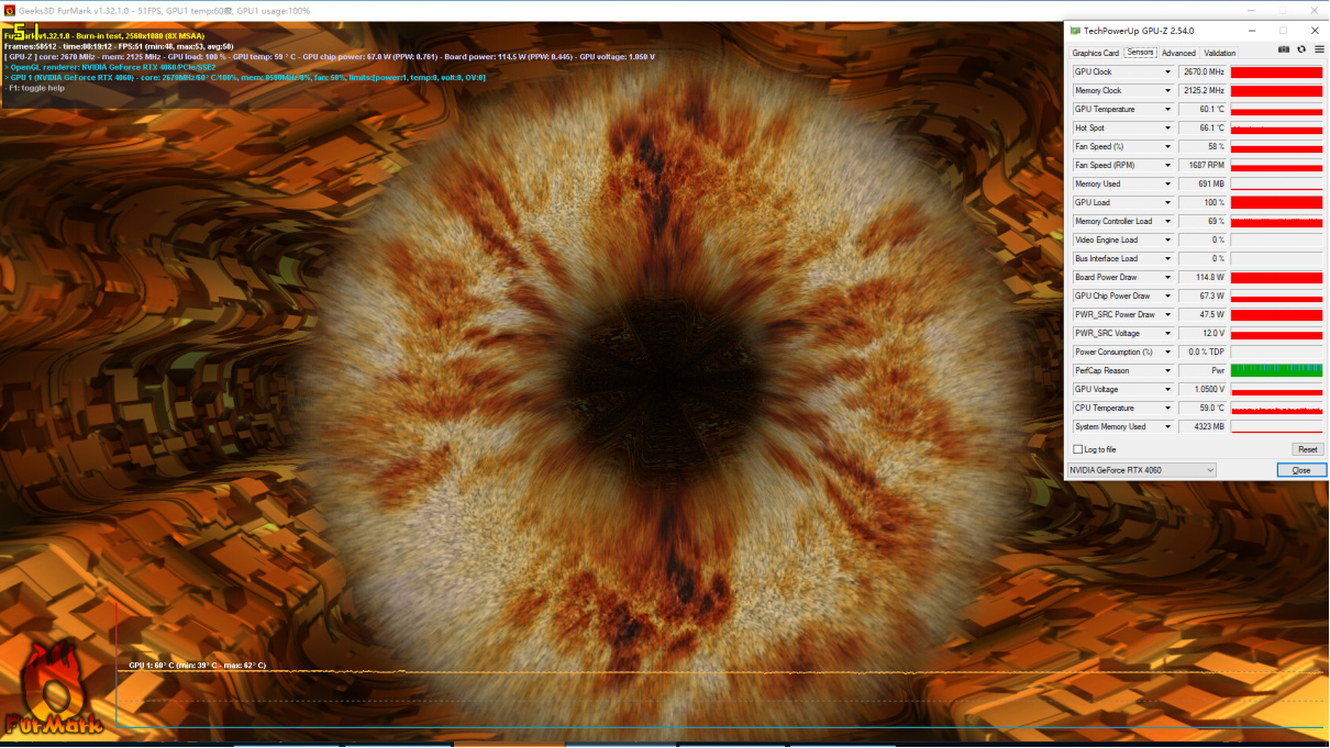 上圖中所呈現的是FurMark測試中影馳 GeForce RTX 4060 金屬大師GPU的功耗控制能力。開啓FurMark後,等待溫度與功耗數據穩定,最終所獲得的結果是GPU的功耗爲114.8W,溫度爲60.1℃。在滿載功耗的情況下,影馳 GeForce RTX 4060 金屬大師的溫度依舊能保持在一個穩定的情況,可想而知其散熱性能的優良發揮。以及值得注意的是,其滿載時所需要的功耗僅僅達到114.8W,極低的能耗保證了玩家們在日常使用時能夠大幅度的降低電力上的消耗。在搭配整機時,官方推薦搭配400W以上的電源配置即可,對於需要升級配置的玩家而言,這一消息可以說是一大喜訊了。