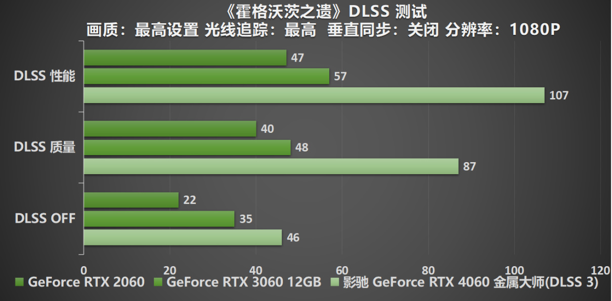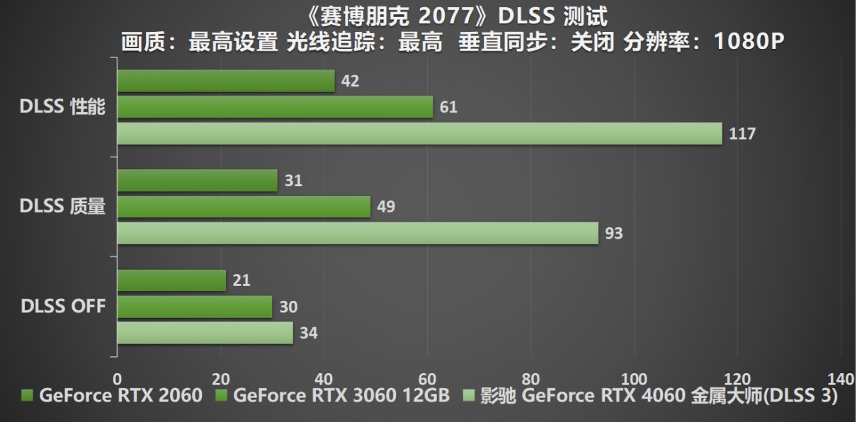 接下來將通過對比影馳 GeForce RTX 4060 金屬大師,GeForce RTX 3060 12GB和GeForce RTX 2060三張顯卡的遊戲數據,讓玩家們更加直接的瞭解到影馳 GeForce RTX 4060 金屬大師的性能魅力,以及NVIDIA DLSS 3技術非凡的性能增長。遊戲測試選擇了五款已支持DLSS 3 技術的遊戲,分別是:《賽博朋克 2077》、《霍格沃茲之遺》、《消逝的光芒2:人與仁之戰》、《巫師3:狂獵》以及《光明記憶無限》。在測試中,將會統一保持光線追蹤技術開啓的情況下,測試DLSS 3技術以及DLSS 2技術開啓和關閉的效果。畫面分辨率均採用1080P,對比數據爲DLSS 關閉,DLSS 質量模式 和DLSS 性能模式。影馳 GeForce RTX 4060 金屬大師 採用NVIDIA DLSS 3技術,GeForce RTX 3060 12GB和GeForce RTX 2060 則是NVIDIA DLSS 2技術。