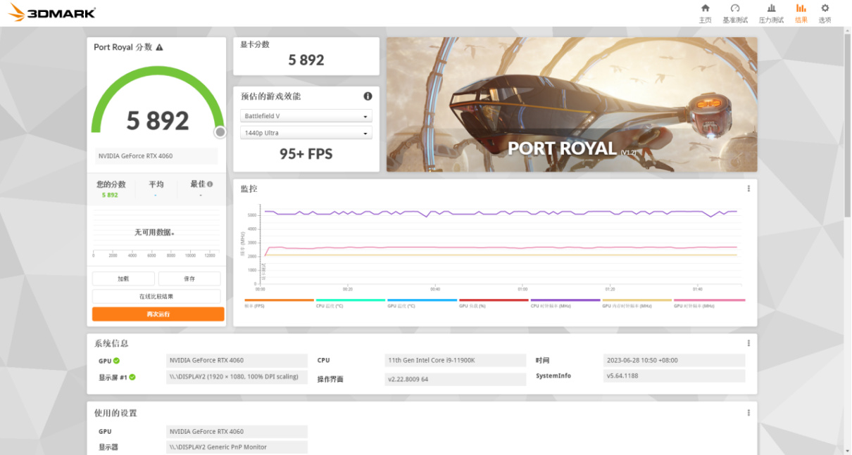 而在3DMark Portal Royal光追測試,影馳 GeForce RTX 4060 金屬大師 發揮也極其的穩定,得到了5892的成績。這也意味着影馳 GeForce RTX 4060 金屬大師 這張“甜品卡”能夠支持玩家們享受95+FPS的光追遊戲。