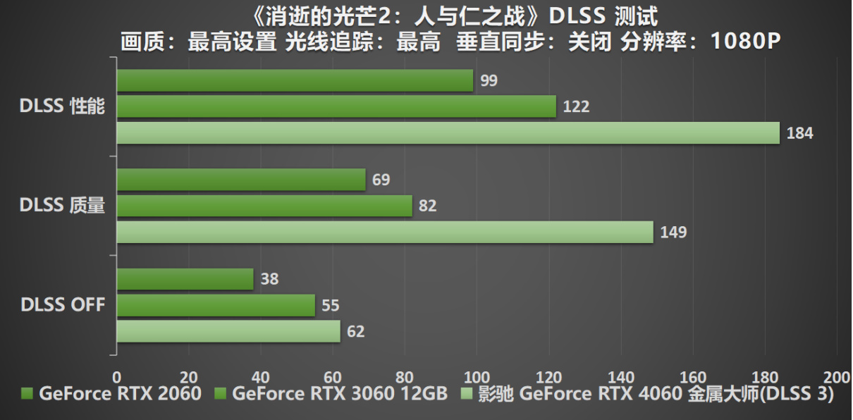 在《消逝的光芒2:人與仁之戰》中,影馳 GeForce RTX 4060 金屬大師即便沒有DLSS技術的加持,也可以達到流暢運行的分數。而開啓這項技術後的成績更是好看了——在DLSS質量模式下的幀數爲148幀,而DLSS 性能模式下更是高達184幀。這高達196.7%的性能上漲可謂是非常亮眼了。放眼看到GeForce RTX 3060 12GB,開啓DLSS 性能模式後的成績爲122幀的好成績,但是對比起影馳 GeForce RTX 4060 金屬大師,性能上仍是有50.8%的落後。由於《消逝的光芒2:人與仁之戰》對於顯卡的要求不是特別的高,玩家們在遊玩時選擇GeForce RTX 2060 搭配DLSS 性能模式,也可以達到近百幀的優異體驗。