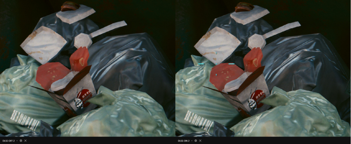 該組對比圖採用《賽博朋克 2077》的遊戲實測,開啓NVIDIA DLSS 技術後,畫面中可以看到整體的細節程度有了上升。能夠真正做到在不損失畫質的前提下,幀數大幅度的提升。關於幀數對比的數據也將會在下文給出,感興趣的玩家們可千萬不要錯過了。