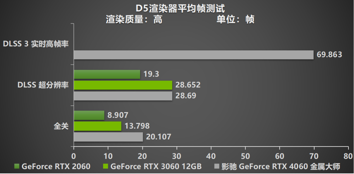 D5渲染器是一款由國內企業南京維伍網絡科技有限公司開發的時光線追蹤渲染器。該款渲染器憑藉着真實的渲染效果,極具實力的兼容性以及簡單易上手的操作等等優點在上線後就備受好評。值得注意的是,作爲NVIDIA的合作伙伴,D5渲染器的最新版本中已然加入了DLSS 3技術的支持。接下來讓我們通過測試,看看影馳 GeForce RTX 4060 8GB金屬大師 的生產力性能吧!