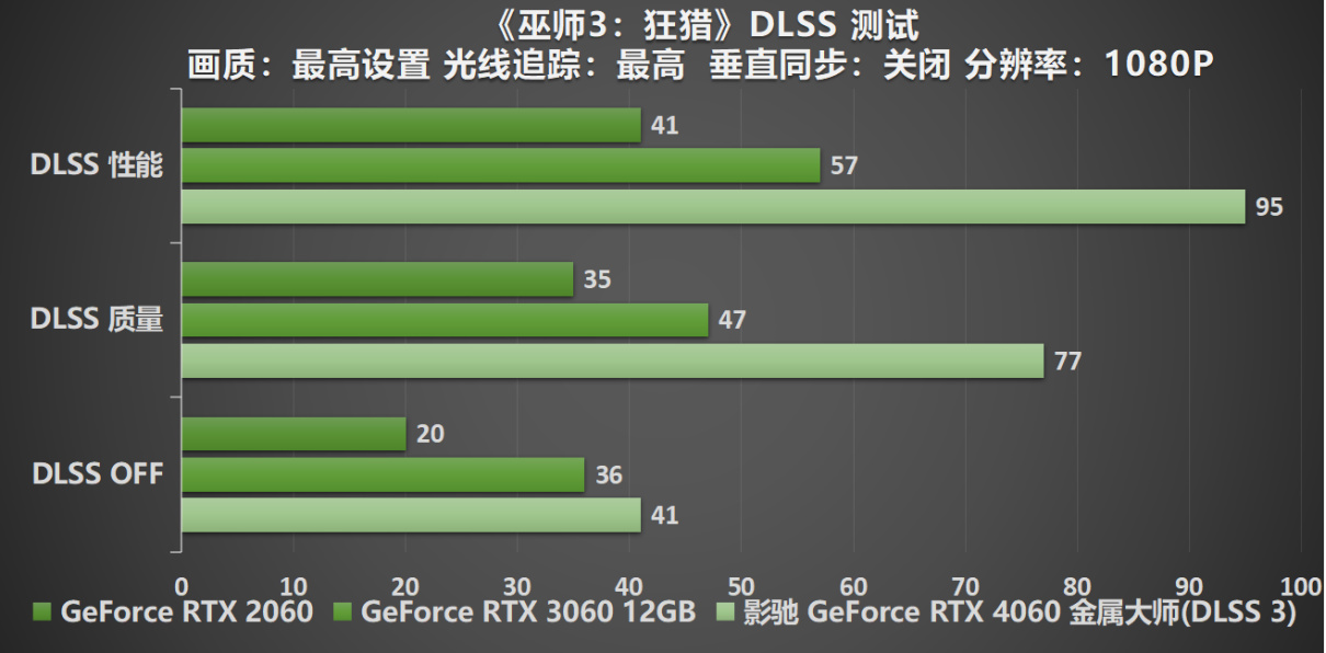 在測試結果中顯示,在《巫師3:狂獵》中,影馳 GeForce RTX 4060 金屬大師在性能上比起GeForce RTX 3060 12GB和GeForce RTX 2060 有着明顯的優勢。憑藉着自身的性能和DLSS技術的加持,影馳 GeForce RTX 4060 金屬大師 擁有着66.6%和131.7%的性能提升,其幀數分別爲95幀,57幀和41幀。