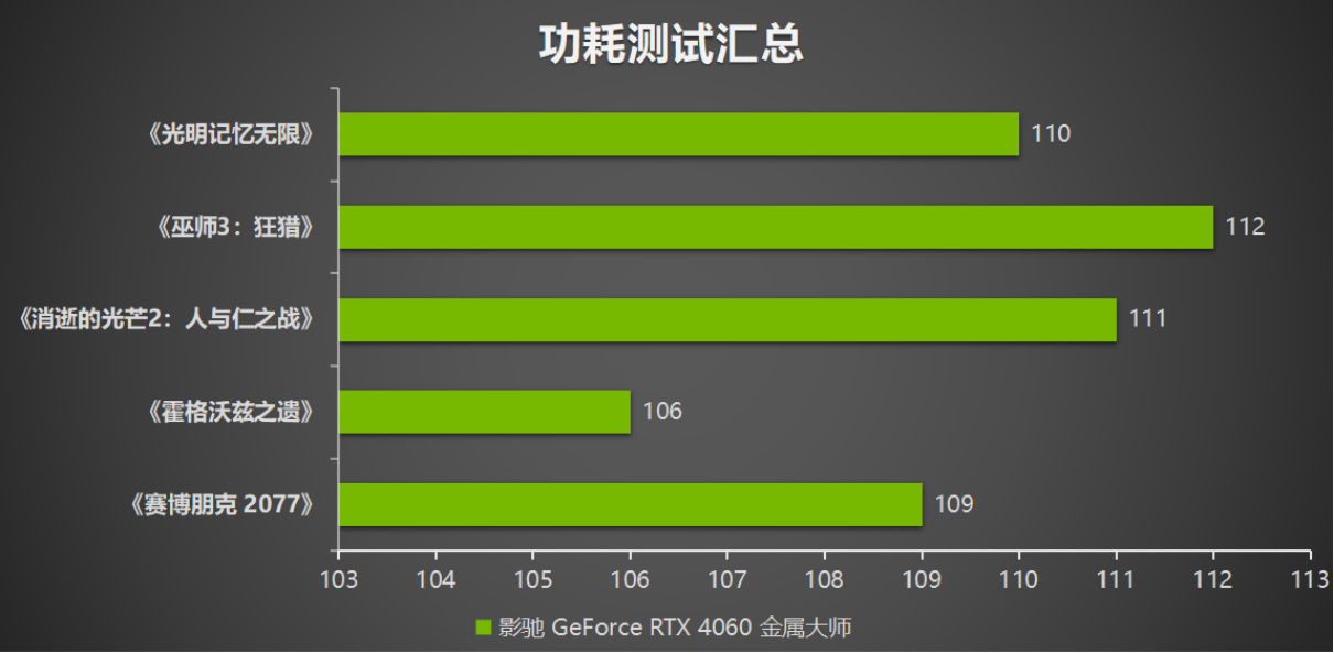 針對以上五款遊戲,數據還進行了實時遊戲運行功耗對比。影馳 GeForce RTX 4060 金屬大師的整體平均功耗僅僅爲109.6W。其中最低功耗《霍格沃茨之遺》功耗達到106W,而最高功耗的《賽博朋克 2077》也僅僅是多了8W,數值達到112W。影馳 GeForce RTX 4060 金屬大師 憑藉着全新NVIDIA Ada Lovelace 架構提供動力支持,爲玩家們實現了低功耗、高性能的絕佳體驗。