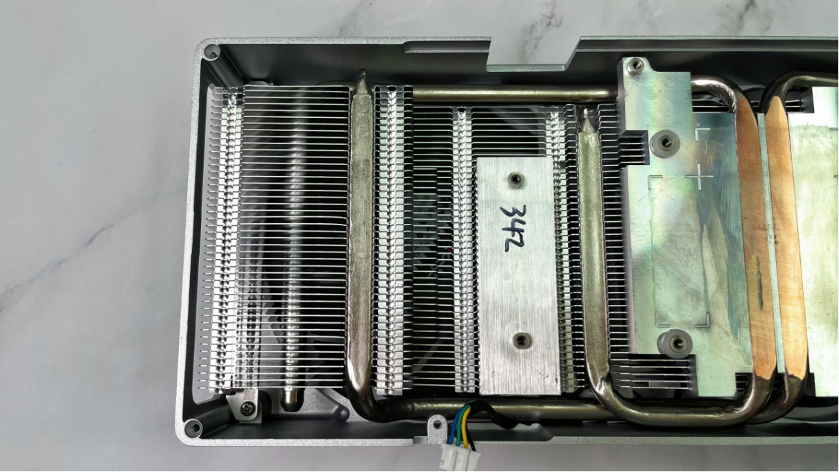 影馳 GeForce RTX 4060 金屬大師沿用了該系列的全金屬外殼和無燈設計方案,採用一體壓鑄鋁合金上蓋。外觀上以宇宙魔方爲靈感,採用不規則的線條呈現該因素,可謂是表面的科幻線條形如魔方即將炸裂釋放能量。 全金屬外殼和背板,採用 CNC 高光亮邊、金屬拉絲、霧面等多種工藝打造,在呈現了極致的美感和科幻感的同時,也做到了輔助散熱的能力、進一步提高散熱性能。擋板、壓鑄件、背板採用聯動設計,使其能夠進一步保護顯卡背面元件,防止 PCB 變行,同時還可以輔助散熱,加快熱量傳導。在顯卡尾端散熱設有貫穿開孔,其功效能做到減少尾部重量的同時輔助散熱,給風流提供最優選的散熱通道。