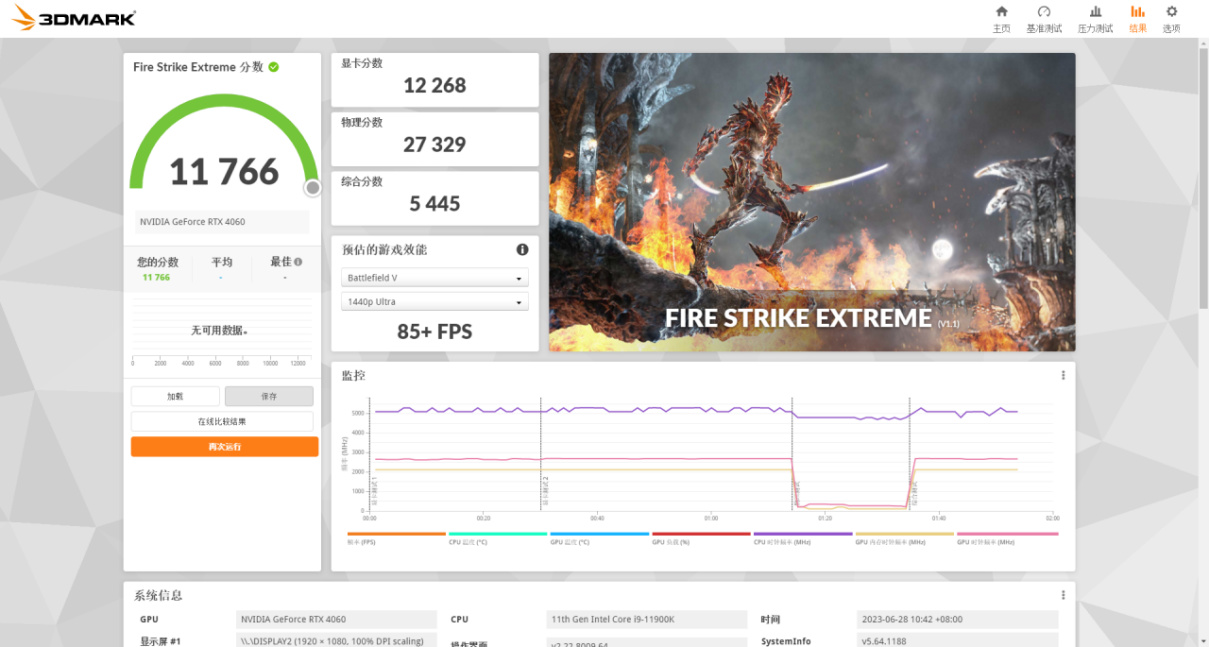 另一邊值得注意的測試即爲3D Mark Fire Strike Extreme測試,影馳 GeForce RTX 4060 金屬大師所獲得的分數爲12268。該分數相對其餘其他兩張顯卡而言已然甩開一節差距。同時該分數也表明了,影馳 GeForce RTX 4060 金屬大師作爲RTX 40系列的甜品卡,其性能完全足夠支持玩家們擁有流暢穩定的運行,且能夠支持玩家以及創作者們享受高刷新率。