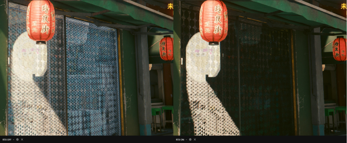 光線追蹤技術開啓前後的對比是非常明顯的,僅僅是一個按鍵的事情,玩家們將會感受到完全不一樣的遊戲世界。通過對比圖玩家們可以直觀的感受到——在光線追蹤技術開啓前,遊戲畫面中的光陰體現僅僅是平面上的存在,即似乎色塊的體現。而在光線追蹤技術的支持下,遊戲畫面變得更加生動且真實,光線折射,陰影等等細節體現都將更加貼合現實世界的物理呈現。