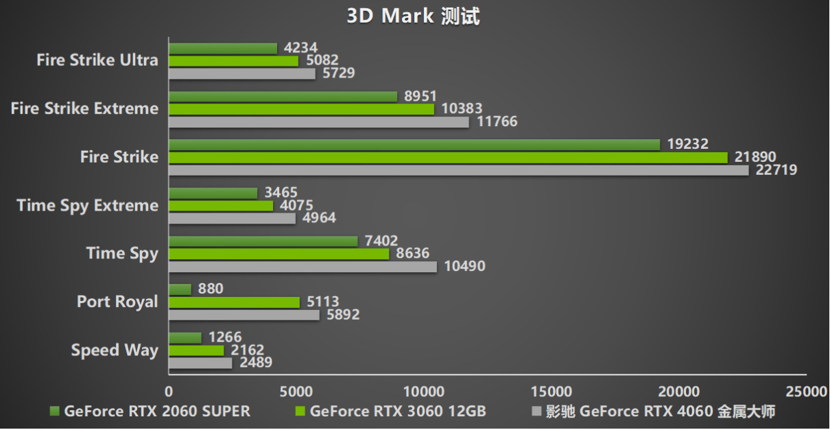 在3D Mark 基準測試中,對於影馳 GeForce RTX 4060 金屬大師,GeForce RTX 3060 12GB和GeForce RTX 2060三張顯卡均採用了測試。通過數據比較,玩家們可以明顯的得到,影馳 GeForce RTX 4060 金屬大師在各項測試中,對比前代的同等級顯卡,在性能上有都擁有着提升與優化。