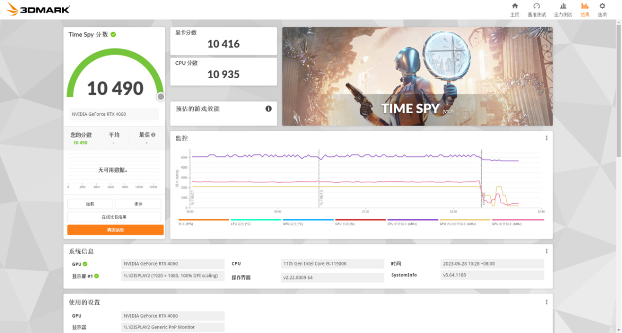 可以看到,影馳 GeForce RTX 4060 金屬大師在3D Mark Time Spy DX12 測試,所獲得的顯卡分數爲10490。
