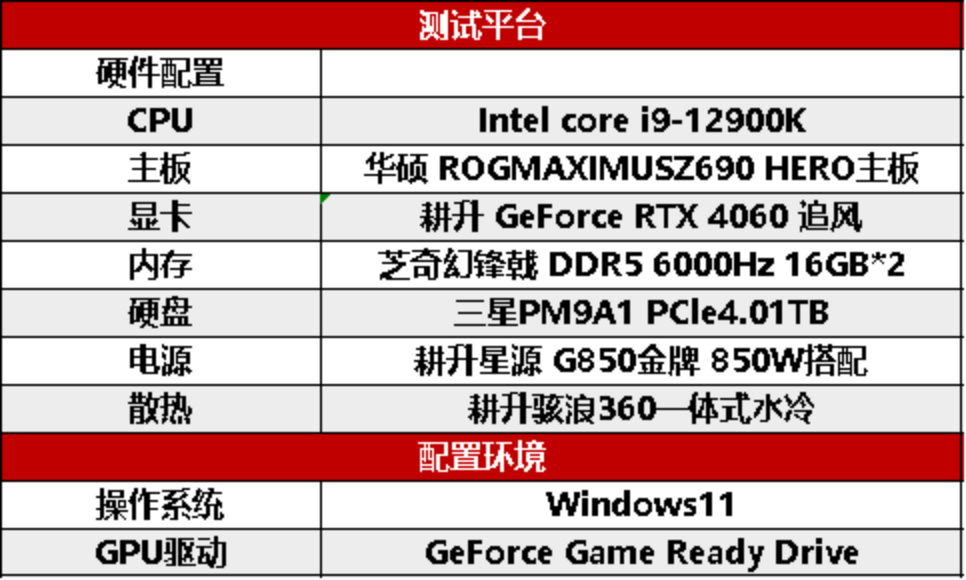 本次测试环节使用了Intel Core i9-12900K,主板方面选择了十分全面的ROG MAXIMUS Z690 HERO主板,内存方面启用2条芝奇 幻锋戟 DDR5 6000Hz 16GB,电源采用的是 耕升 星源 G850金牌 850W,散热方面则是 耕升 骇浪360 一体式水冷,这套散热配置可以为GPU提供足够的降温以及供电 ,这套配置在正常使用中,足以跑满耕升 GeForce RTX 4060 追风的全部性能,同时本次测试将同时与GeForce RTX 3060 12GB和GeForce RTX 2060 进行直接比对,让我们来看看耕升 GeForce RTX 4060 追风的优越表现吧。
