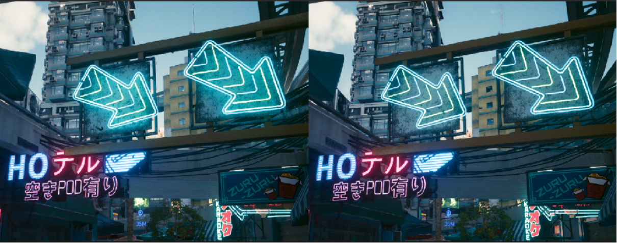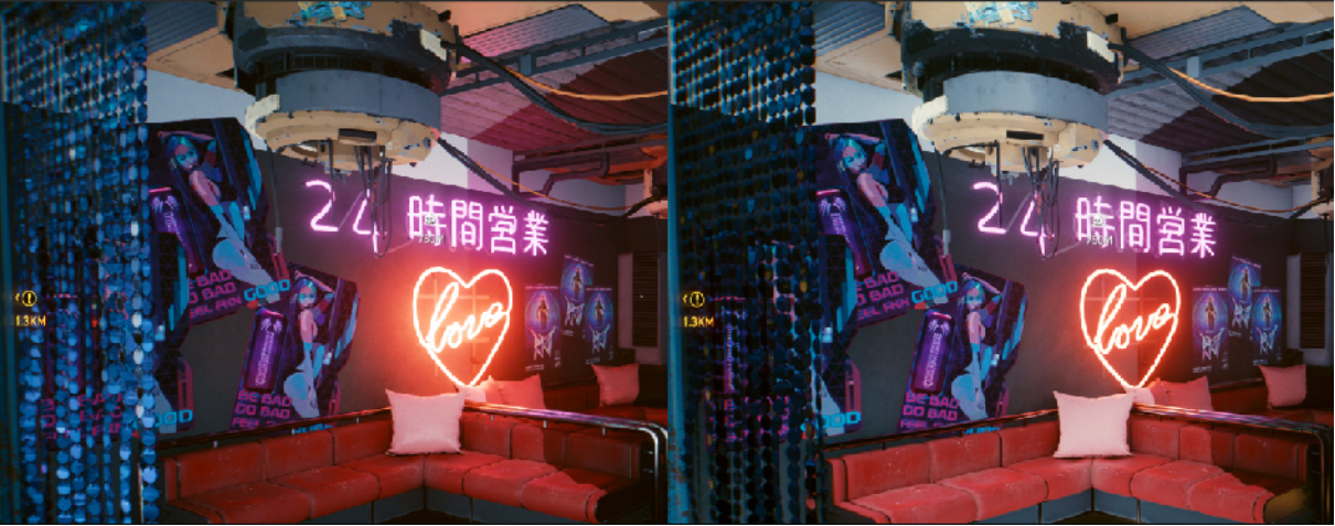 开启后,可观察到画面中光影的区别,无论是柔和的自然光源,还是灯红酒绿的霓虹灯光源,全新的光线追踪技术都将把最好的光影细节呈现给各位玩家。