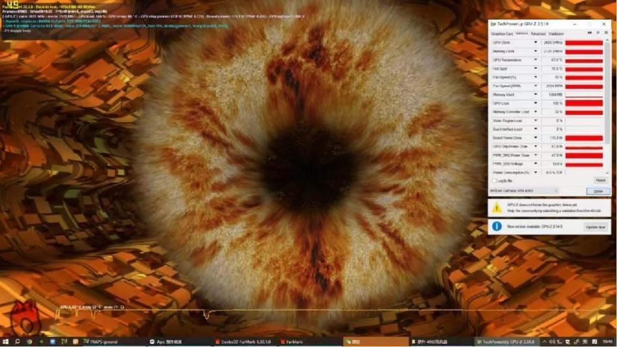 FurMark的烤机测试是了解GPU功耗和GPU控制能力的测试。开启FurMark进行测试,测试过程使用FurMark对GPU进行20分钟左右的烤机,当GPU温度和功耗数据趋近于稳定时,得到了耕升 GeForce RTX 4060 追风 的GPU满功耗数据。GPU的满功耗温度为67度,满载显卡功耗为115W。GPU处于满载后,耕升 GeForce RTX 4060 追风也能保持在一个较为稳定的状态,在强大散热的加持下,GPU的温度提升幅度并没有很多。