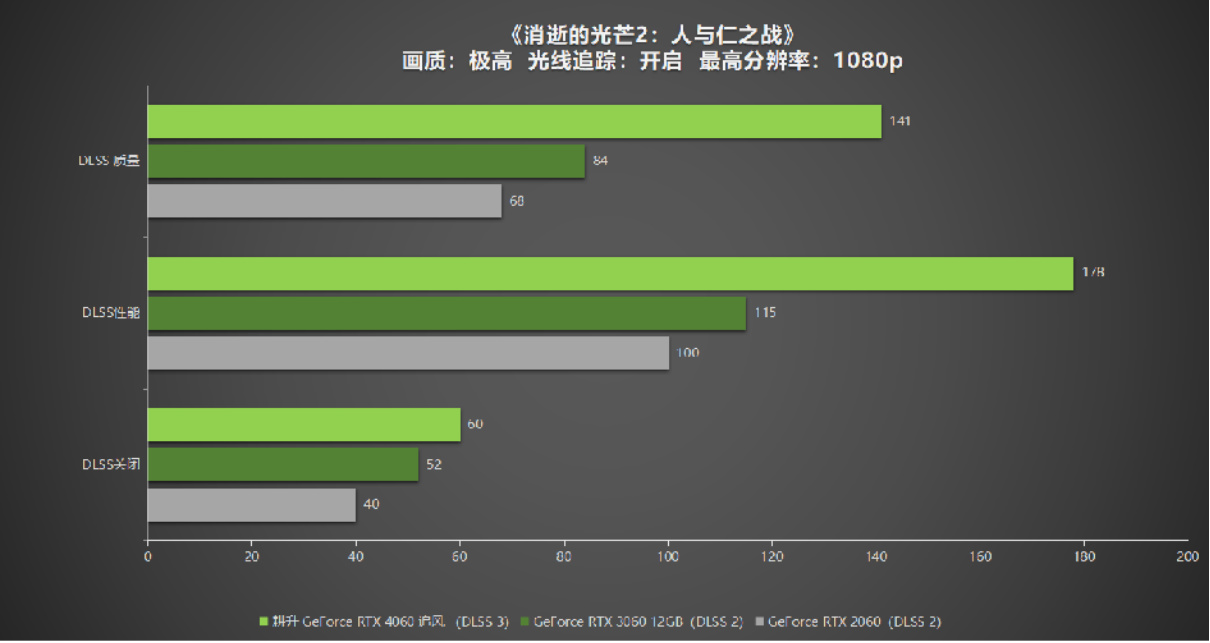 《消逝的光芒2:人与仁之战》对于DLSS的优化非常优异,在1080P分辨率光追开启DLSS 性能模式下,GeForce RTX 3060 和GeForce RTX 2060 的帧率即可分别来到 115和100帧。耕升 GeForce RTX 4060 在开启DLSS 3的前后测试中,提升幅度高达150%左右,同时耕升 GeForce RTX 4060 追风 在开启 DLSS 3 性能模式后帧率一度来到了178帧,这样巨大的提升幅度可见 DLSS 技术对于游戏的体验优化相当重要。在开启DLSS 3质量模式下,耕升 GeForce RTX 4060 追风的帧率也一度来到了140帧。